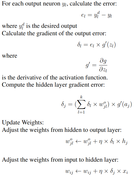 1. Feed the MLP an input pattern x = (x1, x2, ...., xn) from the training set. 2. MLP generates an output pattern y = (y1, y2, ...., yk) 3. Compare y with the desired output or target yd, to get the error quantity. 4. Adjust the weights using the error quantity so that in the next iteration,y will be closer to yd. 5. Repeat with another input pattern x from the training set.After performing a series of straightforward mathematical derivations, one can arrive at the following algorithm that trains an MLP.