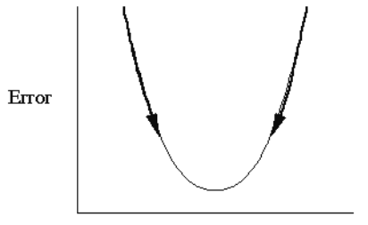 An error function represents the difference over a set of inputs.Adjust the weights so that E decreases. A common technique used: Gradient descent Adjust the weights so that E decreases along the gradient.