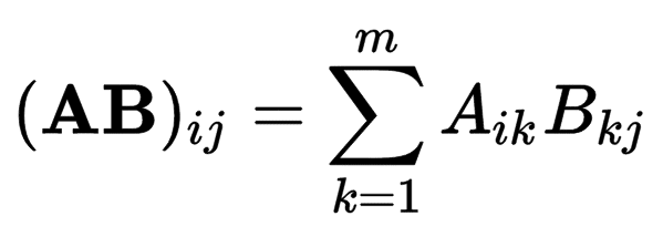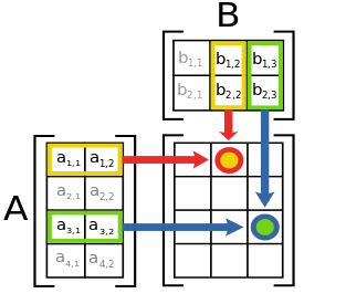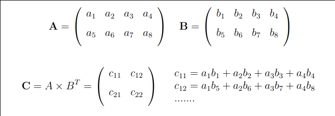 Each element of A x B is a dot product of a row vector of A and a column vector of B. Dimensions: A: 4 x 2 B: 2 x 3 ----------------- AxB: 4 x 3 |