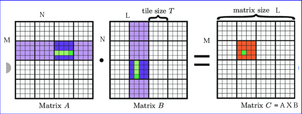 - A thread within a block (tile) calculates a dot product of the two submatrices